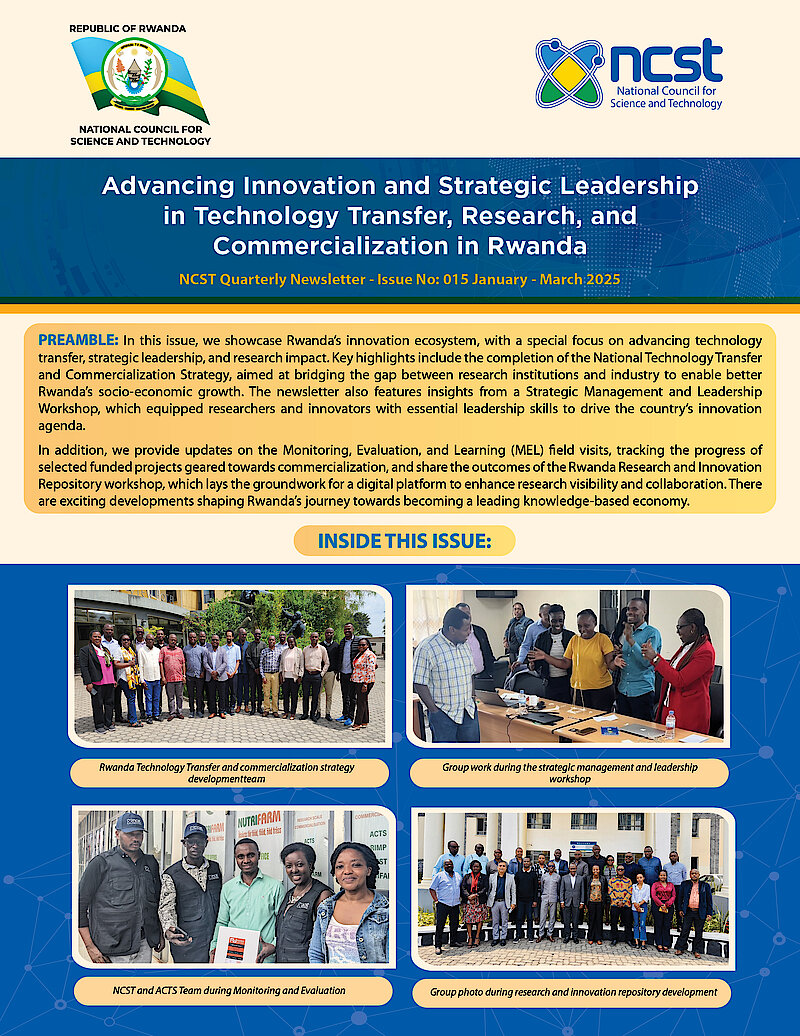 The National Council for Science and Technology (NCST) is pleased to announce the release of its Quarterly Newsletter – Issue No. 015. This edition highlights NCST’s ongoing efforts to advance innovation and promote strategic leadership in technology transfer, research, and commercialization within Rwanda’s growing innovation ecosystem.