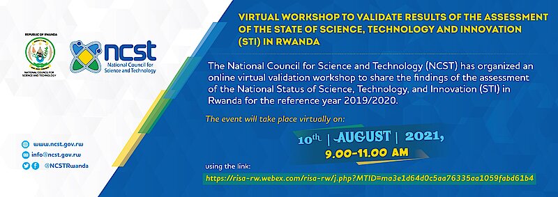 The National Council for Science and Technology (NCST) Management would like to invite its esteemed partners to the Virtual Workshop to validate results of the state of science and technology and innovation (STI) in Rwanda Schedules, to take place on August 10th 2021from 9:00 to 11:00 AM.