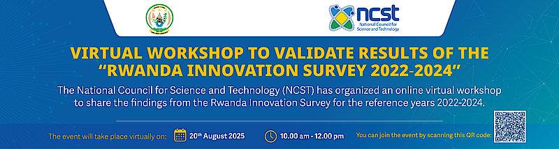 The National Council for Science and Technology (NCST) is organizing a Virtual Workshop to Validate the Results of the Rwanda Innovation Survey 2022–2024. This workshop, scheduled for 20th August 2025 from 10:00 a.m. to 12:00 p.m. and will provide an opportunity to share and discuss key findings from the survey conducted for the reference years 2022 to 2024. Stakeholders and partners are invited to participate in this important session by joining online using this link or scanning the QR code on the event banner.